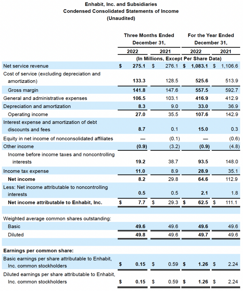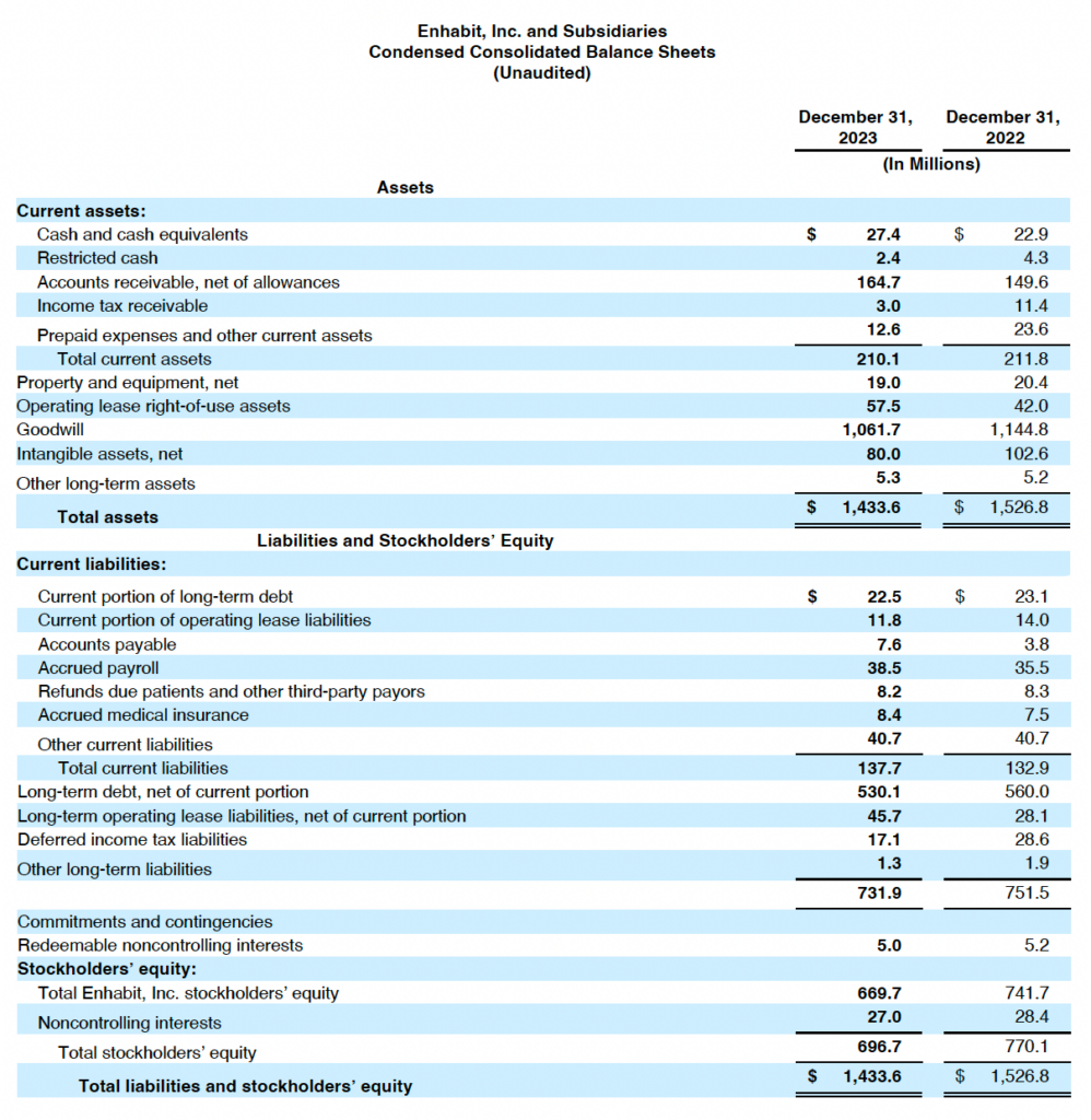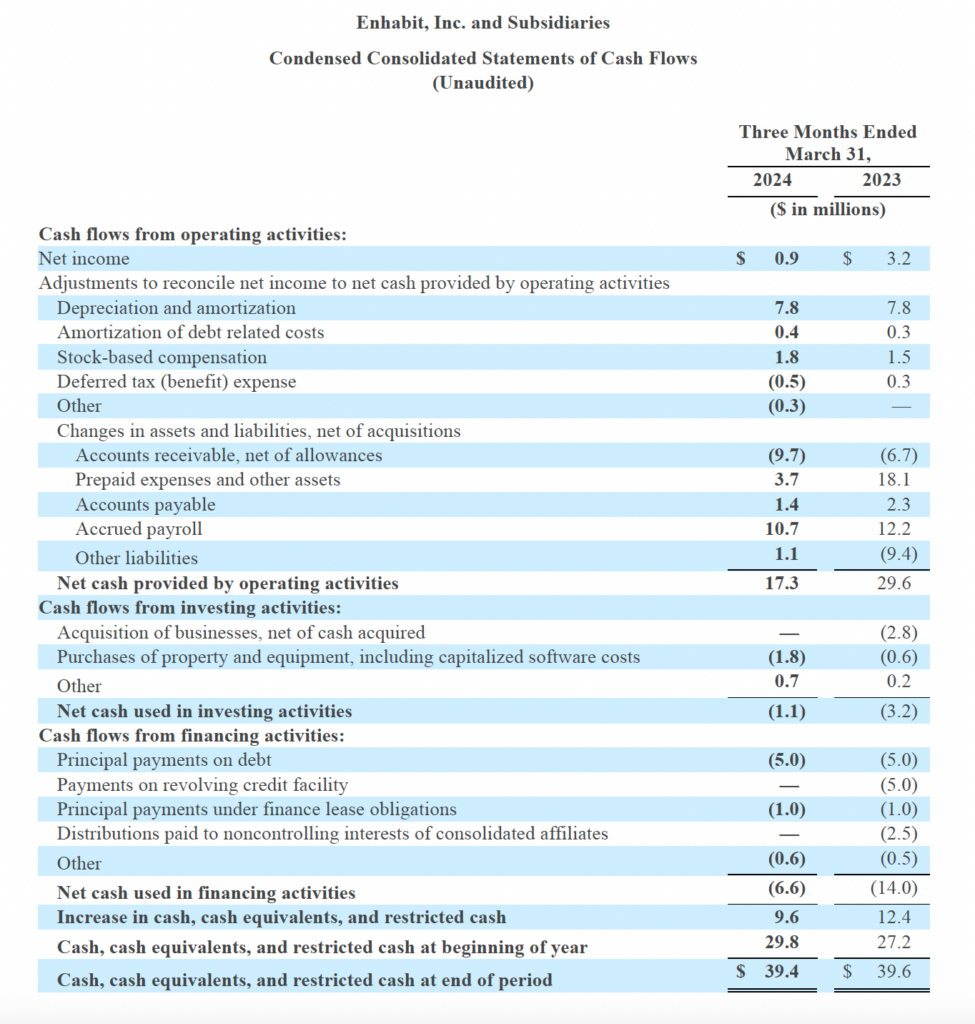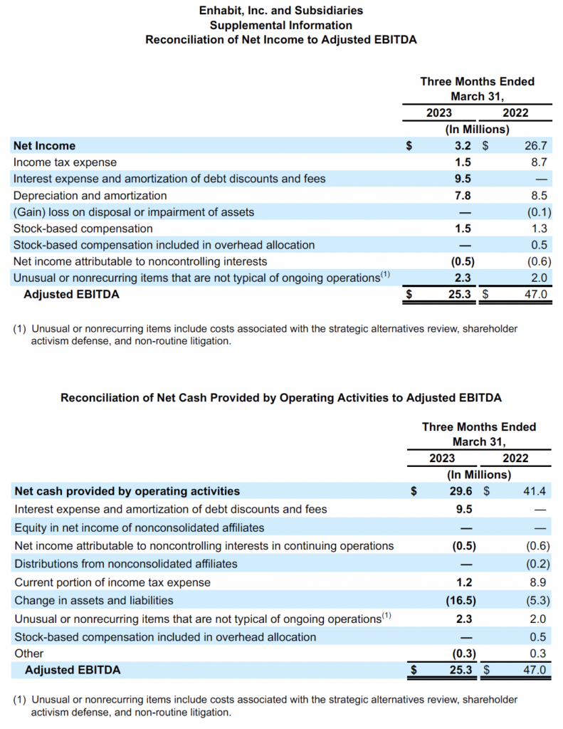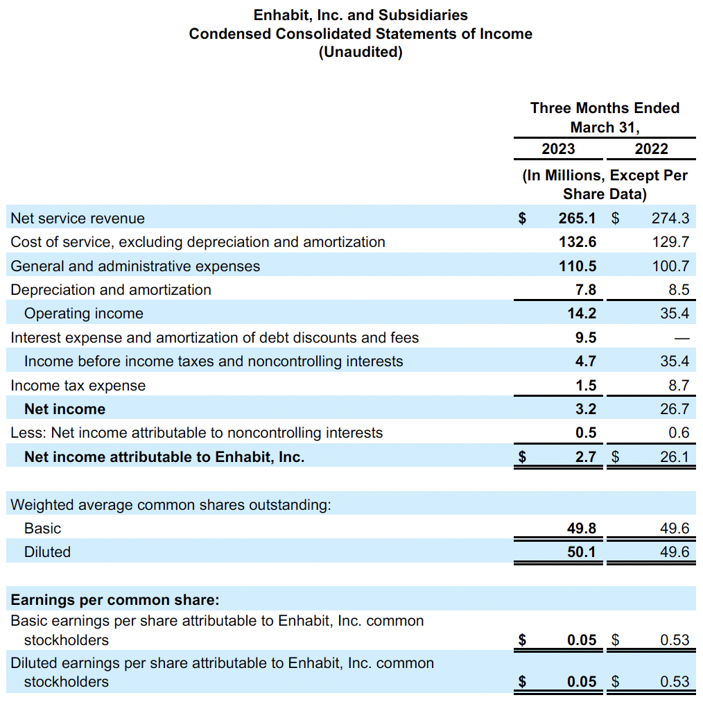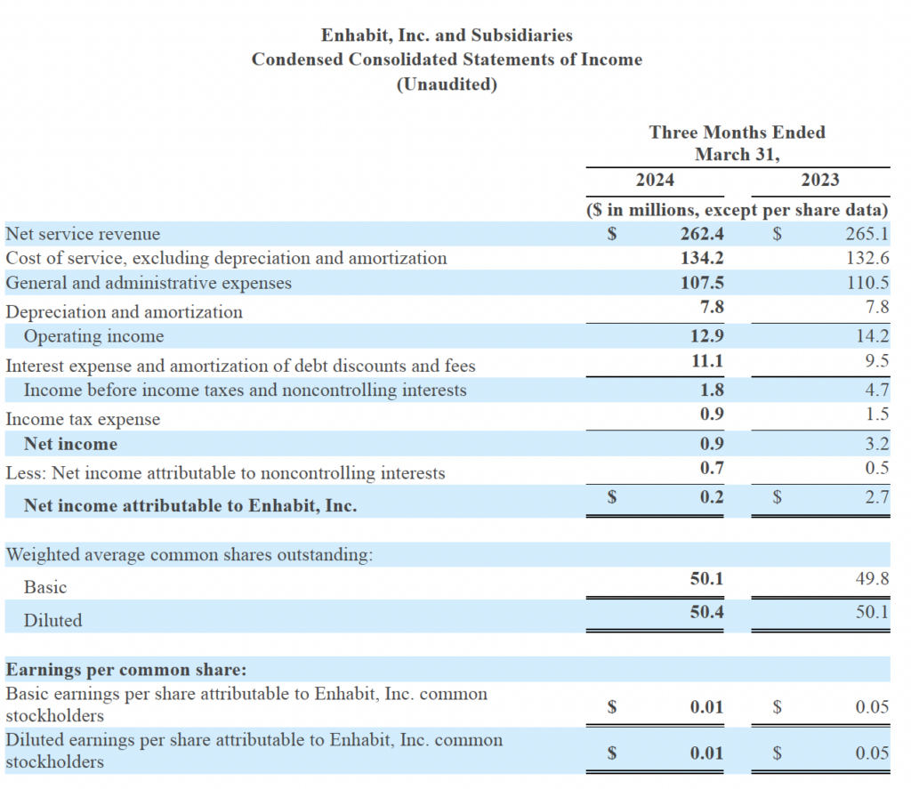 • Net income attributable to Enhabit, Inc. of $0.2 million