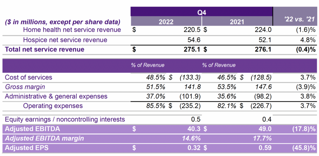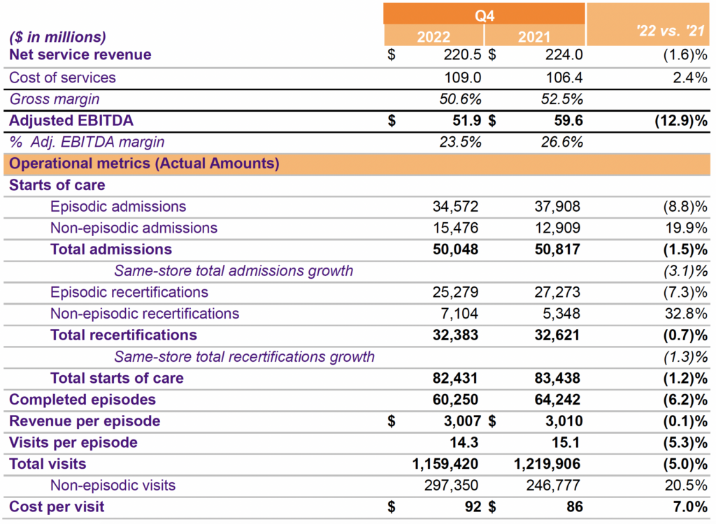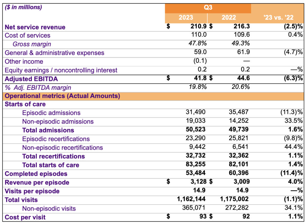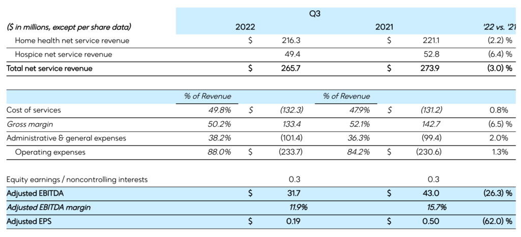 Consolidated third quarter 2022 results were impacted by the resumption of sequestration, continued shift to more non-episodic patients in home health, lower volumes in hospice, and higher cost of services related to labor, mileage reimbursement and fleet costs.