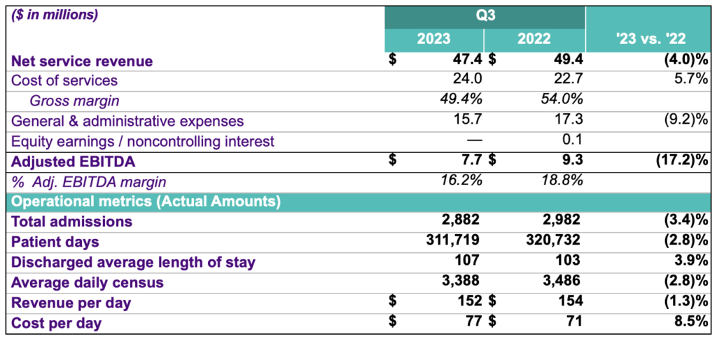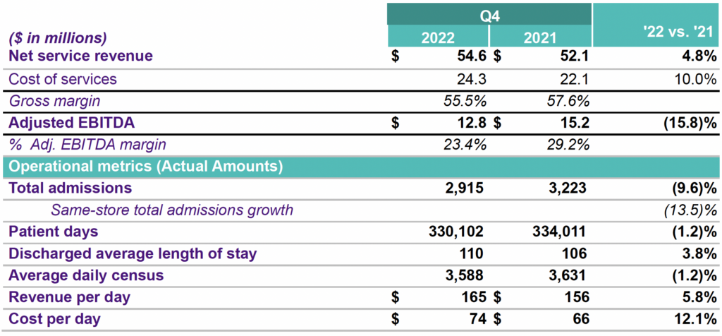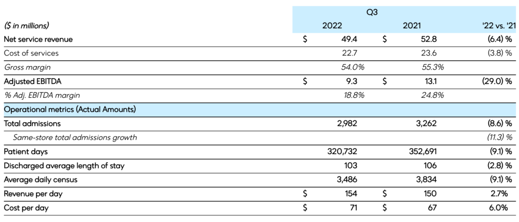 The year-over-year decrease in revenue primarily was due to the decrease in average daily census and resumption of sequestration. Admissions increased sequentially from the second quarter of 2022 primarily due to improvements in staffing capacity and an increase in referral sources.