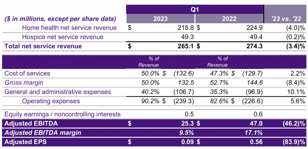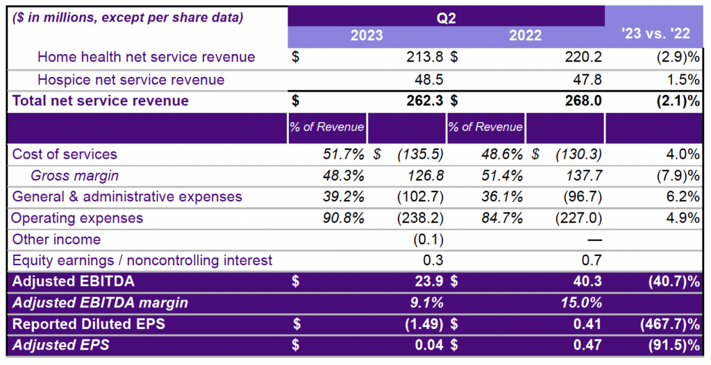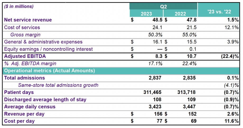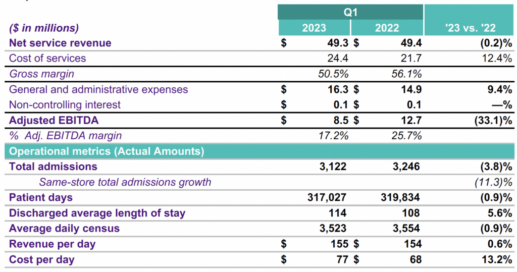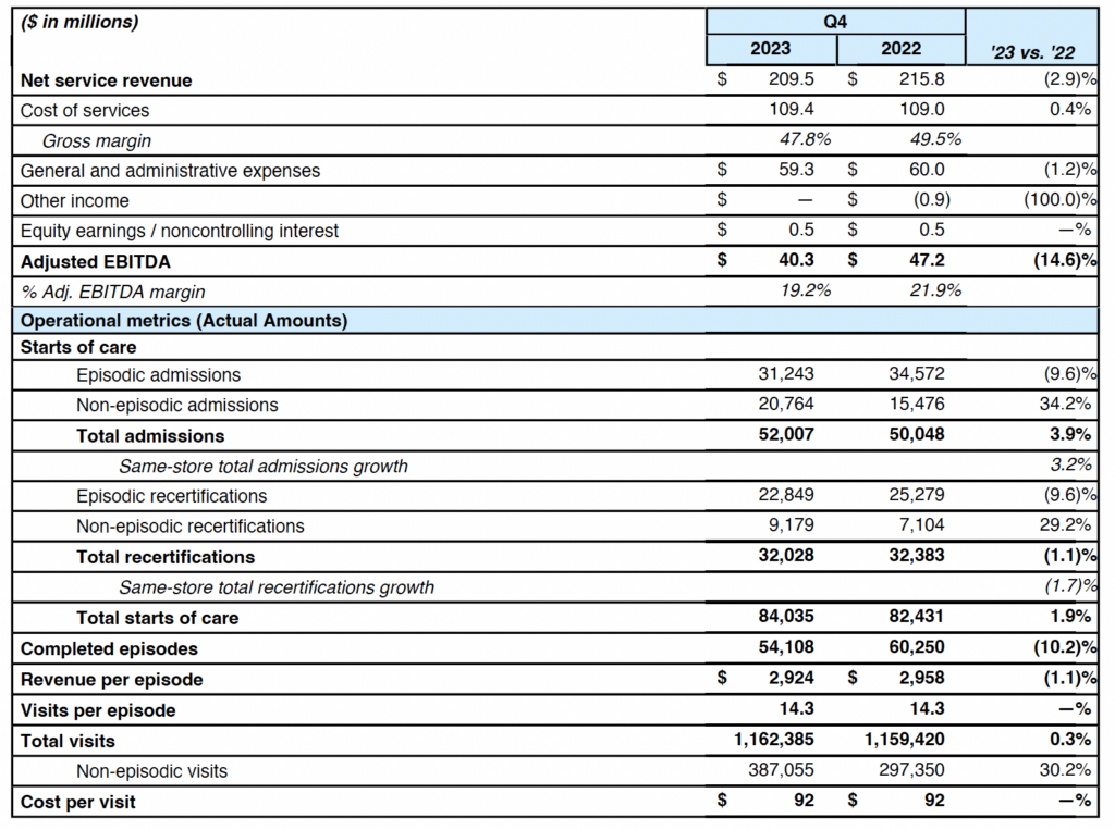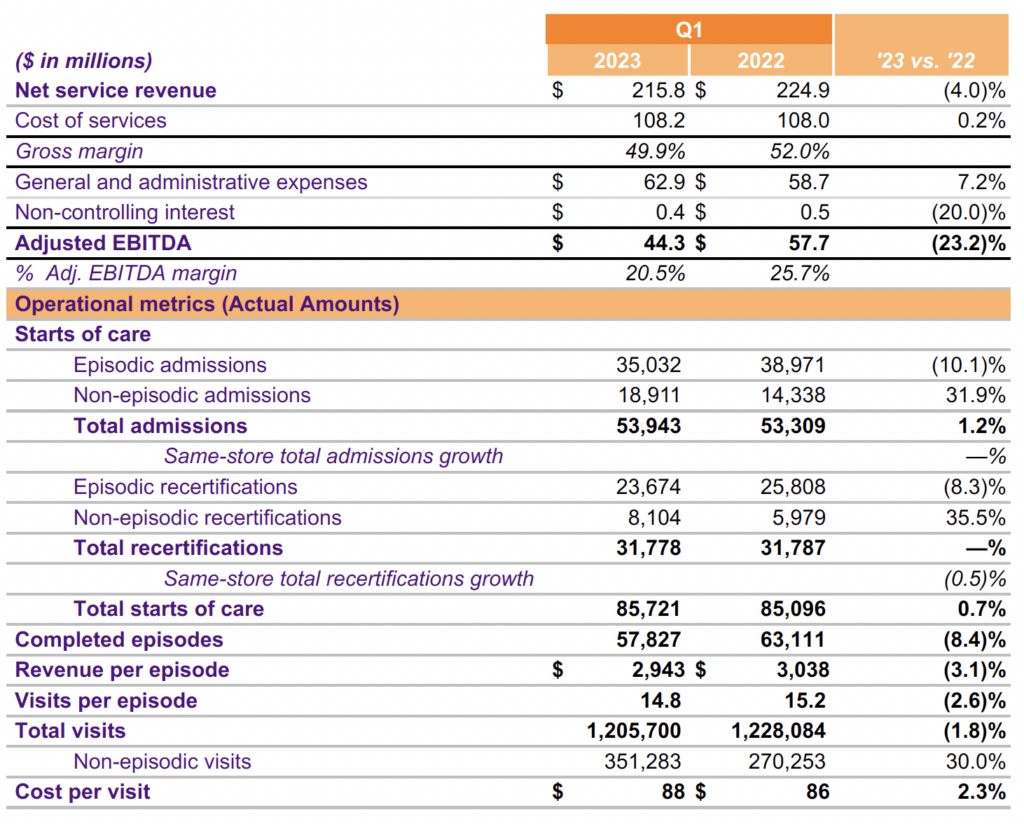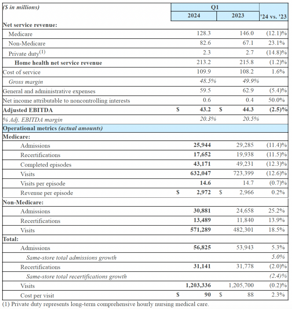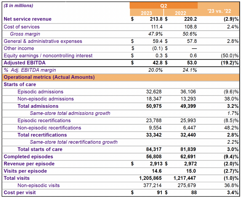 Adjusted EBITDA decreased year over year primarily due to the payor mix shift to more non-Medicare admissions and increased cost of service, offset by a reduction in general and administrative expenses. Cost per visit increased 2.3% year over year primarily due to merit and market rate increases. General and administrative expenses declined year over year primarily due to a new organizational structure implemented in the first quarter of 2023 to align the Company’s sales and operations teams.