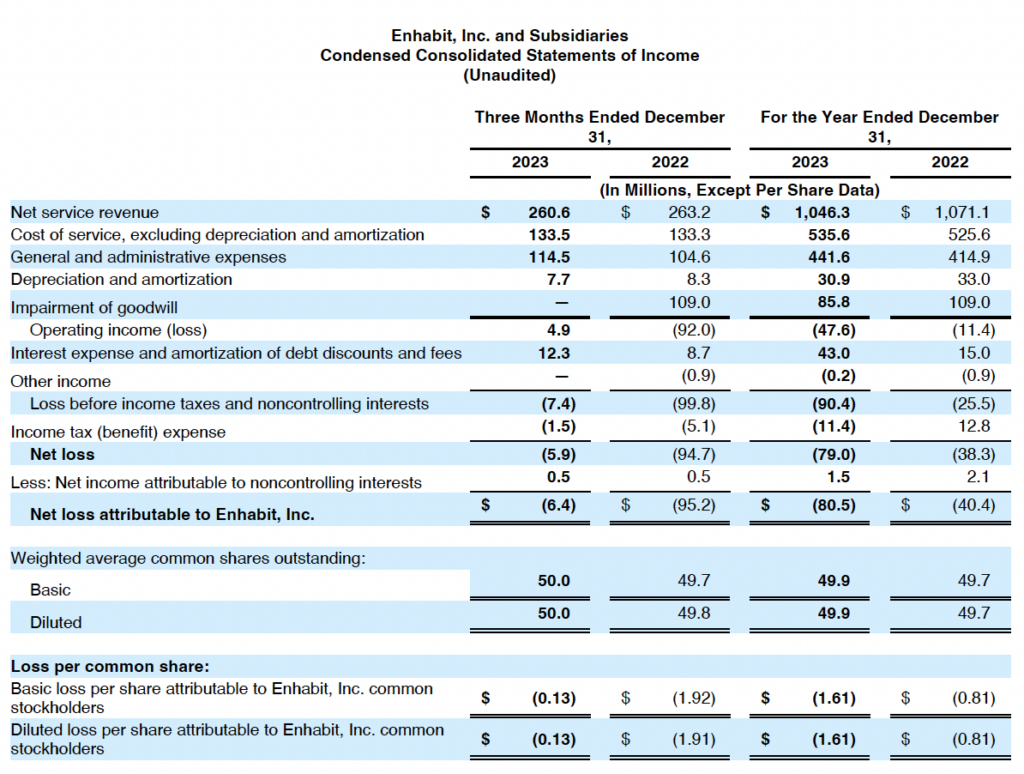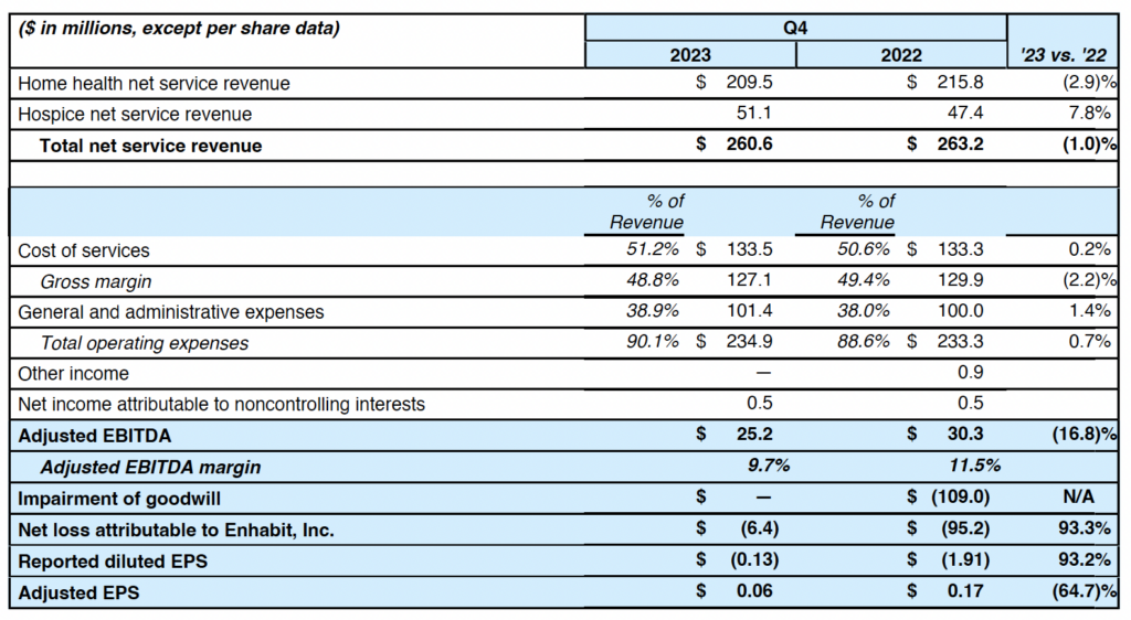 DALLAS–(BUSINESS WIRE)– Enhabit, Inc. (NYSE: EHAB), a leading home health and hospice care provider, today reported its results of operations for the fourth quarter ended December 31, 2023.