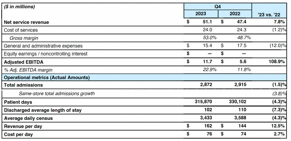 Adjusted EBITDA increased year over year primarily due to a decrease in general and administrative expenses.Cost per day increased 2.6% year over year primarily due to a decrease in patient days. General andadministrative expenses declined year over year primarily due to the restructuring of hospice back office staffingin the third quarter of 2023.