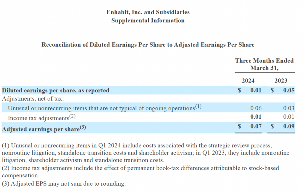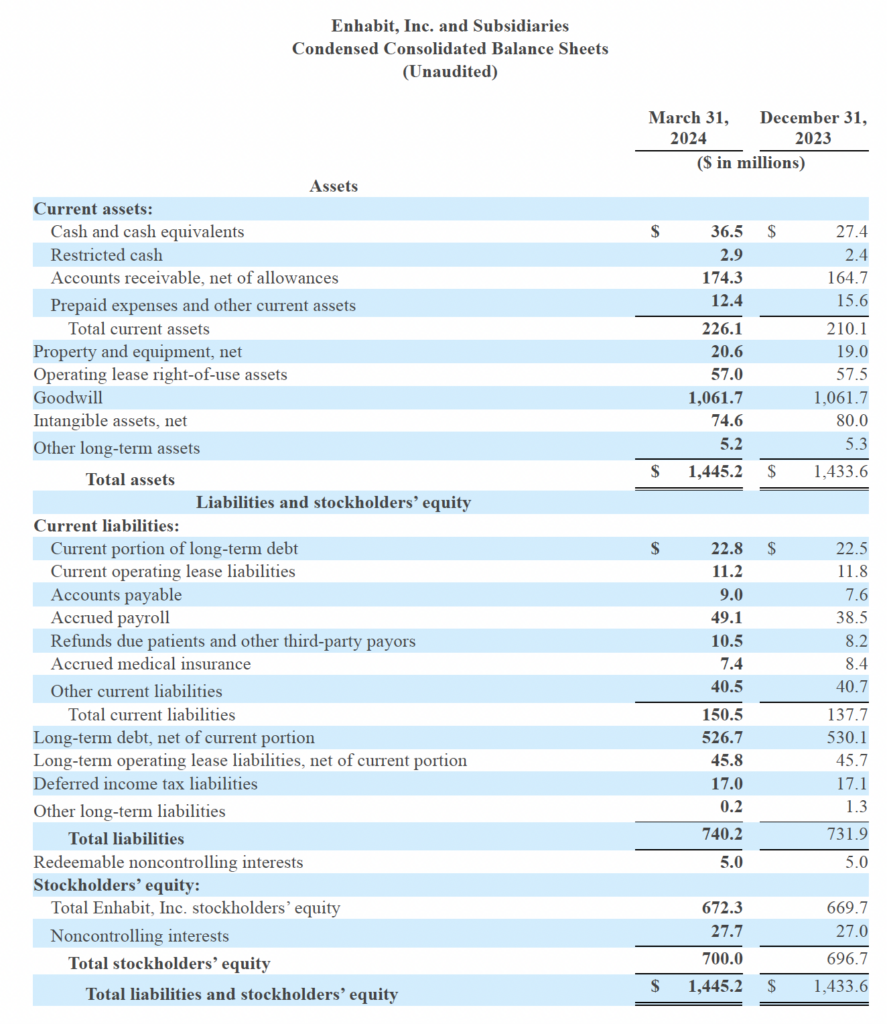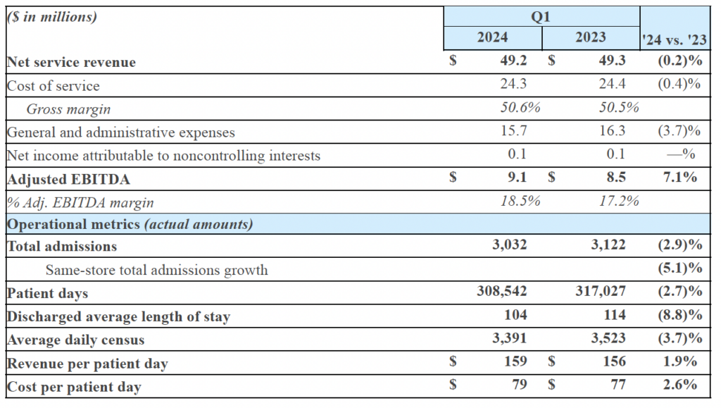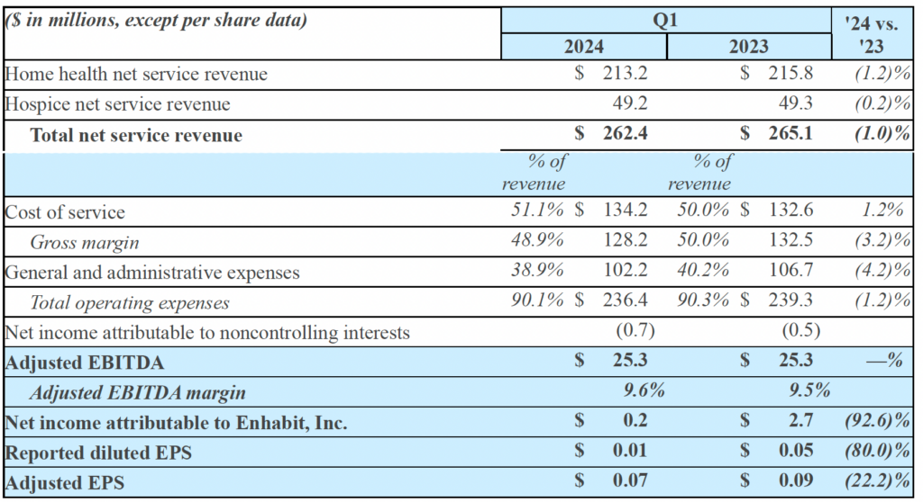 DALLAS–(BUSINESS WIRE)– Enhabit, Inc. (NYSE: EHAB), a leading home health and hospice care provider, today reported its results of operations for the first quarter ended March 31, 2024.
