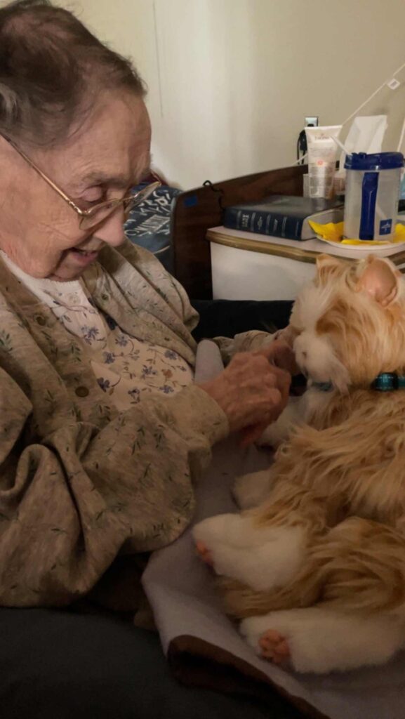“One of our hospice volunteers works at the Department on Aging,” she said. “She knew about a grant through her office where you could get a robotic therapy cat for dementia patients. All we had to do was fill out the application and then go pick up the cat!”